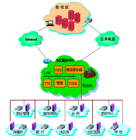 以國際標(biāo)準的VXMLl技術(shù)為主導(dǎo)的小區(qū)服務(wù)中心系統(tǒng)可以與互聯(lián)網(wǎng)輕易地連通,從而為小區(qū)的服務(wù)網(wǎng)點走出小區(qū)的地域限制做好技術(shù)上的儲備。vxml的易開發(fā)和易擴展性,使得遠程服務(wù)的增加,幾乎不需要任何成本的追加,任何第三方服務(wù)提供者具備vxml業(yè)務(wù),都可以直接掛到服務(wù)中心上來。