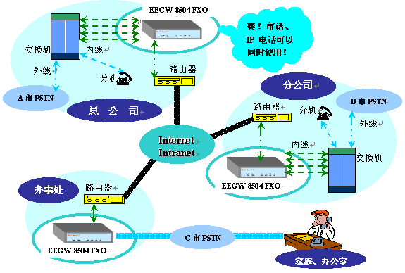 EEGW 8504網(wǎng)關(guān)利用現(xiàn)有的IP網(wǎng)絡(luò)資源實現(xiàn)語音通信,它提供4條線路可以連接PSTN網(wǎng)或企業(yè)交換機(jī)。它由于只需支付上網(wǎng)費而大幅度減少話費支出,這是實現(xiàn)企業(yè)總公司與分公司間、SOHO族異地間通訊的最經(jīng)濟(jì)方案。