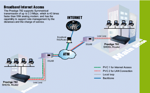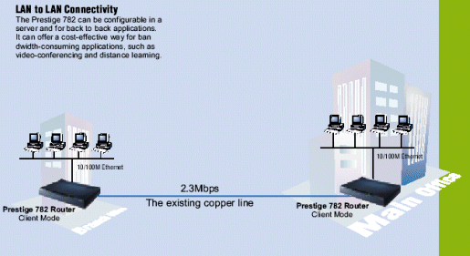 Prestige 782在服務(wù)器中可配置支持背對背(back to back)應(yīng)用,為利用雙絞線實現(xiàn)寬帶應(yīng)用提供一種經(jīng)濟的解決方案(例如實現(xiàn)電視會議和遠(yuǎn)距離學(xué)習(xí))。