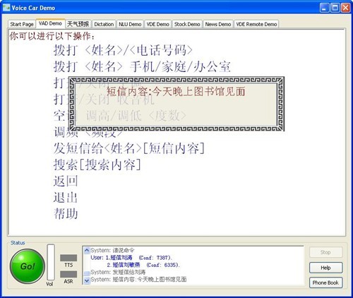 Nuance:可以修改。到你需要修改的那個(gè)“見”上,你再說“見”或者見面,它就給你弄過來了。但是我們覺得在中國(guó)區(qū),在中文的修改上,這未必可能是個(gè)好辦法,我們也在試探另外一種辦法,這個(gè)辦法我現(xiàn)在可以給大家介紹一下。就是這樣,我要說修改,那么那個(gè)語音合成TS就開始給你再讀,剛才不是讀了一遍嗎,它再給你讀,但是這一次讀,它是一個(gè)詞一個(gè)詞地讀。他說,今天我不吭聲,晚上,我不吭聲,他說七點(diǎn),我也不吭聲,等他說“見”的時(shí)候,我說“見面”,他知道我說的這個(gè)詞要把那個(gè)覆蓋掉,再改,再把它改了。這樣可能更合理一些,就是你手不用去摸什么東西,眼睛看什么東西,完全能保持你在駕駛的時(shí)候,這是我們目前還在進(jìn)行開發(fā)的一個(gè)東西,或許下一次如果我們?cè)儆袡C(jī)會(huì)我們就可以把這個(gè)演示一下。