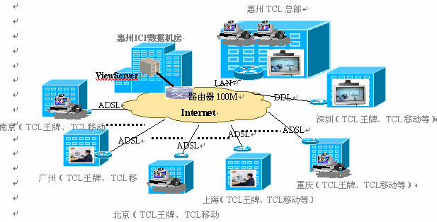 2) 多媒體控制服務(wù)器ViewServer托管到ICP數(shù)據(jù)機(jī)房,采用100M共享,各企業(yè)及分公司的網(wǎng)絡(luò)接入靈活選擇,可以選用ADSL、LAN等寬帶接入;