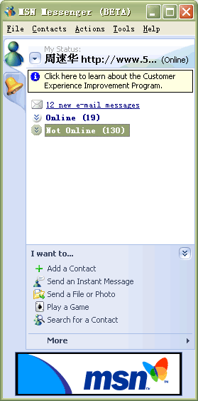 5月26日,微軟最新即時通訊軟件MSN Messenger的最新版本MSN Messenger Beta 6.0.0250被提前遭遇外泄,使得大家提前領略到了微軟最新的即時通訊軟件風采。這也是微軟.net計劃中的一個重要組成部分,也讓我們看到了一些微軟“格林威治(Greenwich)”的影子!案窳滞(Greenwich)”――是微軟基于.net戰(zhàn)略的能夠實時進行通信等的服務器軟件的開發(fā)代號。由于未對外正式發(fā)布,此次公開的是MSN