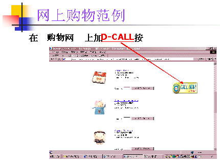簡單地說,就是當(dāng)有客戶瀏覽到網(wǎng)上購物的網(wǎng)頁時,若有任何疑問或想立即購買,只要點擊在網(wǎng)頁上的“按鈕”鍵,就可以直接接通到網(wǎng)站的客服中心,實現(xiàn)即時地語音互動。也不需再像以前那樣發(fā)E-MAIL或撥電話號碼了。效果可謂是立竿見影。(如圖示)