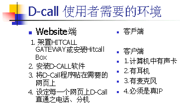 D-CALL指的是”Direct Call on Web”,提供電子商務(wù)中客戶與企業(yè)間網(wǎng)上實現(xiàn)網(wǎng)上實時語音互動平臺。