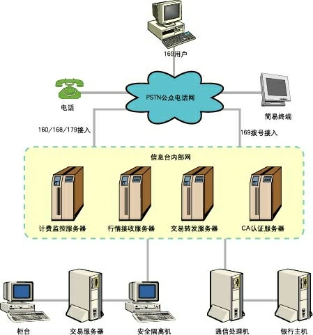 2) 與169多媒體信息平臺通過網關互聯(lián),最大限度實現(xiàn)數(shù)據(jù)共享,并且證券公司營業(yè)部可通過一條DDN完成電話委托和網上交易的業(yè)務,大大降低證券公司日常運營費用,同時能最大限度地吸引異地、鄉(xiāng)鎮(zhèn)用戶。