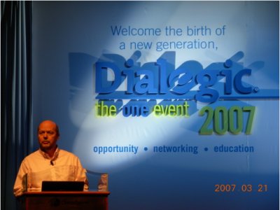 大會首先由Dialogic公司的全球資深副總裁 James Besley致辭!拔覀兓貋砹耍 ,James一句意味深長的開場白引來了全場長時間的熱烈鼓掌。是的,曾幾何時,Dialogic在全球CTI領(lǐng)域是何等的輝煌,上個世紀(jì)九十年代他們?nèi)〉眠^驕人的業(yè)績,占據(jù)了全球市場的絕大部分份額,稱之為當(dāng)時CTI行業(yè)的先驅(qū)和領(lǐng)導(dǎo)者實不為過。