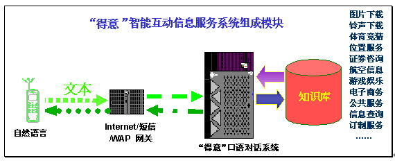 在現(xiàn)有的數(shù)據(jù)通信和信息服務(wù)的技術(shù)平臺(tái)上,加入"得意口語(yǔ)對(duì)話系統(tǒng)運(yùn)行平臺(tái)",就能夠讓用戶在通過(guò)Internet/SMS/WAP等各種通信手段,在電腦、手機(jī)等設(shè)備上以自然語(yǔ)言的形式享受相關(guān)領(lǐng)域的智能互動(dòng)信息服務(wù)。