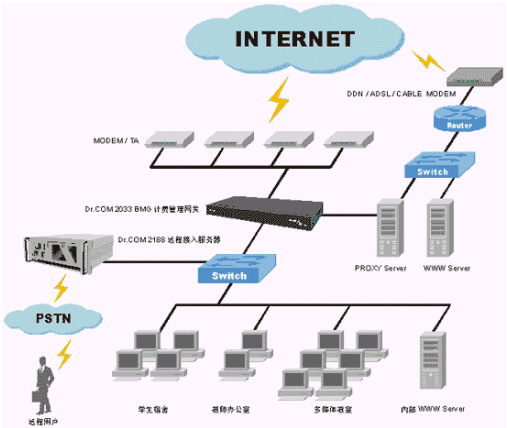Dr.COM 2188遠(yuǎn)程接入服務(wù)器系列產(chǎn)品,該系列產(chǎn)品向用戶提供了內(nèi)置的15個(gè)MODEM用作遠(yuǎn)程接入,配套提供專業(yè)開戶、計(jì)費(fèi)、統(tǒng)計(jì)、監(jiān)視和查詢等網(wǎng)絡(luò)版營運(yùn)軟件及數(shù)據(jù)庫接口和串行計(jì)費(fèi)接口。使校園網(wǎng)用戶可通過公用電話網(wǎng)(PSTN)對(duì)校園網(wǎng)內(nèi)資源進(jìn)行訪問。