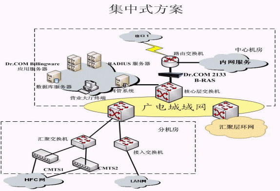 根據廣電城域網目前網絡的規(guī)模,以及以后的擴展,采用集中接入認證與計費,統(tǒng)一管理的方案,集中接入指:接入服務器部署在各個匯聚層的匯聚點,即在網絡出口安裝寬帶接入服務器,由寬帶接入服務器對所有用戶進行身份認證、接入控制、實時計費、數據采集,并將賬單和訪問日志等傳送至綜合業(yè)務系統(tǒng)。統(tǒng)一管理指在中心機房就可以進行全部的管理,包括:網絡設備管理;用戶管理;經營策略管理;賬務管理;安全管理;數據分析。提供完整的用戶資料分析,使用習慣分析,運營統(tǒng)計等詳細分析報表。