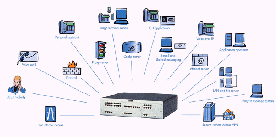 - 一體化:將多項(xiàng)功能集成到一個單一設(shè)備中,這些包括:因特網(wǎng)接入、E-mail服務(wù)器、局域網(wǎng)、計(jì)算機(jī)電話集成(CTI)、呼叫管理(嵌入式個人助理及語音信箱,內(nèi)部移動通信等)。