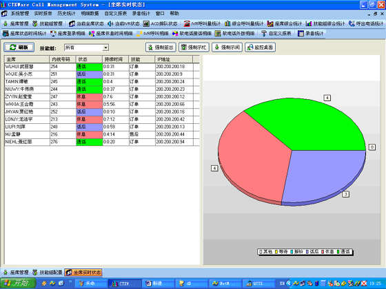 當(dāng)前座席狀態(tài):能夠提供座席的狀態(tài)表示,狀態(tài)持續(xù)時(shí)間,對(duì)應(yīng)的技能組,對(duì)應(yīng)的分機(jī)號(hào)碼,對(duì)應(yīng)的IP地址等信息。可以對(duì)任何一個(gè)座席進(jìn)行強(qiáng)制簽出、強(qiáng)制示忙、強(qiáng)制示閑操作?梢詫(duì)任意座席進(jìn)行屏幕監(jiān)控操作(無需任何第三方軟件)。