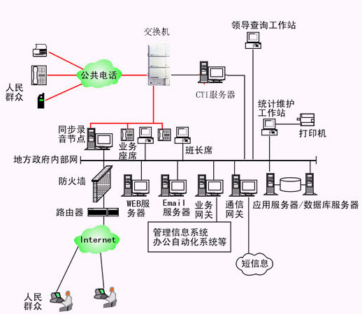 本系統(tǒng)物理結(jié)構(gòu)由帶語音板卡的工控機(jī)或排隊(duì)交換機(jī)、座席分流器、CTI服務(wù)器、IVR(交互式語音應(yīng)答)/IFR(交互式傳真應(yīng)答)服務(wù)器、業(yè)務(wù)代表座席、班長座席、統(tǒng)計(jì)維護(hù)管理工作站、因特網(wǎng)(WEB)服務(wù)器、電子郵件(EMAIL)服務(wù)器、數(shù)據(jù)庫/應(yīng)用服務(wù)器、業(yè)務(wù)網(wǎng)關(guān)服務(wù)器、錄音留言工作站、領(lǐng)導(dǎo)查詢工作站、網(wǎng)絡(luò)系統(tǒng)等構(gòu)成。