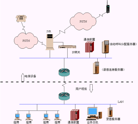 根據(jù)目前連鎖零售服務(wù)企業(yè)的業(yè)務(wù)模式,現(xiàn)提供一個(gè)由IVR自動(dòng)語(yǔ)音應(yīng)答系統(tǒng)和以IP網(wǎng)絡(luò)為基礎(chǔ),以純軟方式交換的呼叫中心相結(jié)合的整體解決方案。即由吉亞公司在北京通信公司建立一個(gè)總的系統(tǒng)信息平臺(tái),平臺(tái)包括IP網(wǎng)關(guān)、ACD服務(wù)器、IVR自動(dòng)語(yǔ)音回復(fù)系統(tǒng)。信息平臺(tái)與連鎖零售服務(wù)企業(yè)的局域網(wǎng)通過(guò)ATM、DDN或幀中繼等專線連接,實(shí)現(xiàn)與客服人員和后臺(tái)數(shù)據(jù)庫(kù)的無(wú)縫連接,在連鎖零售服務(wù)企業(yè)內(nèi)部?jī)H需提供多媒體電腦和客戶服務(wù)人員即可。