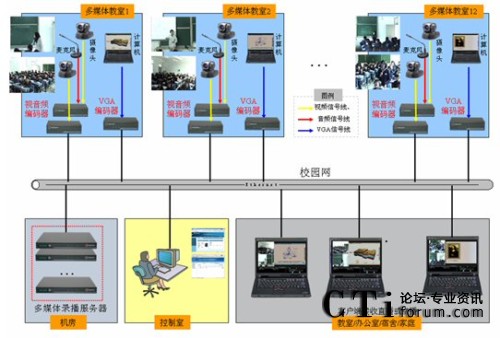 華東師大多媒體錄播項(xiàng)目系統(tǒng)組網(wǎng)如上圖所示。在本項(xiàng)目中12間多媒體教室內(nèi)均實(shí)現(xiàn)錄播功能,編碼器和多媒體錄播服務(wù)器分別部署在教室和機(jī)房內(nèi),管理員在控制室通過網(wǎng)絡(luò)進(jìn)行遠(yuǎn)程管理、控制,老師、學(xué)生可在教室、辦公室、宿舍等任何可以連接校園網(wǎng)的地方實(shí)時(shí)觀看各間教室內(nèi)進(jìn)行的課程,可滿足日常多媒體教學(xué)、課件錄制、微格教學(xué)等應(yīng)用的需要。其中涉及銳取設(shè)備清單及說明如下: