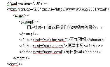 目前人們對HTML已經很熟悉,類似于用于Web網頁標記的HTML,VoiceXML是為語音應用制訂的語音可擴展標記語言。VoiceXML使公用電話網與互聯網的結合體現在三個方面:語音瀏覽器的使用,互聯網和公用電話網的信息共享,以及類似于Web網頁開發(fā)過程的語音應用系統(tǒng)的開發(fā)。