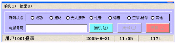 - 坐席功能,坐席人員通過電腦鼠標(biāo)操作,取新客戶資料,點(diǎn)擊撥號(hào),同時(shí),用鼠標(biāo)操作記錄撥號(hào)過程和通話過程的一些設(shè)置(撥號(hào)成功、忙線、無人接、客戶反饋信息等)。坐席電腦將分類顯示忙線電話列表、無人接電話列表、感興趣客戶列表等信息,以便做下一輪撥號(hào)參考。