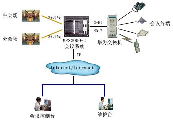 該會(huì)議系統(tǒng)和廊坊電力的會(huì)議系統(tǒng)組網(wǎng)方式相同,通過3個(gè)數(shù)字中繼,與華為用戶交換機(jī)互連,通信采用NO.7信令。4路4線中2路接主會(huì)場(chǎng)調(diào)音臺(tái),2路接分會(huì)場(chǎng)調(diào)音臺(tái),實(shí)現(xiàn)會(huì)議室擴(kuò)音設(shè)備的接入。通過以太網(wǎng)口與D-LINK網(wǎng)絡(luò)交換機(jī)互連,接入秦皇島電力的局域網(wǎng),實(shí)現(xiàn)維護(hù)管理及會(huì)議控制等功能。