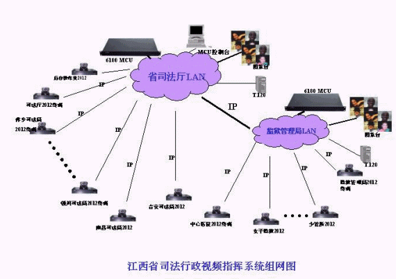 江西司法視頻會議系統(tǒng)的拓?fù)浣Y(jié)構(gòu)如圖所示。整個視頻會議系統(tǒng)為星型拓?fù)浣Y(jié)構(gòu),其中二級網(wǎng)以省司法廳和省監(jiān)獄管理局為主會場,放置2個MCU;另外,包括11個地市司法局的分會場(南昌、九江、贛州、吉安、撫州、鷹潭、萍鄉(xiāng)、新余、上饒、景德鎮(zhèn)、宜春),14個監(jiān)獄和農(nóng)場分會場,傳輸網(wǎng)絡(luò)為2M IP網(wǎng)絡(luò),視頻會議協(xié)議為H.323;司法局和監(jiān)獄管理局也可以單獨(dú)成網(wǎng),在分別依托省司法廳和省監(jiān)獄管理局MCU的情況下,各地市司法局或監(jiān)獄系統(tǒng)可與省司法廳或省監(jiān)獄管理局單獨(dú)進(jìn)行雙向的視頻會議,整個系統(tǒng)具有很強(qiáng)的靈活性和擴(kuò)展性。