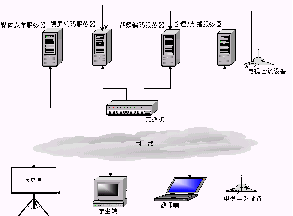 當(dāng)老師端在異地時(攝像頭離服務(wù)器較遠,無法物理連接),可通過"電視會議系統(tǒng)"將老師的圖像及聲音實時傳送到編碼服務(wù)器,桌面課件可以通過PcAnywhere傳送到編碼服務(wù)器。圖像,聲音和桌面課件通過Web Streaming采集壓縮并在網(wǎng)上實時廣播。這種系統(tǒng)架構(gòu)也是當(dāng)今功能比較齊全和完善的一種實現(xiàn)方式。