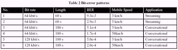 在H.264/AVC的標(biāo)準(zhǔn)化進(jìn)程中,移動(dòng)視頻傳輸?shù)闹匾砸呀?jīng)在3G移動(dòng)傳輸里面通過對基于H.324M的電路交換會(huì)話服務(wù)、包交換會(huì)話和流服務(wù)得到了證實(shí)。這些測試情況允許適當(dāng)?shù)木幋a特征、測試和容錯(cuò)仿真等特征的選擇,同時(shí)也可以得到有意義的測試結(jié)果。在本文,我們將會(huì)把重心集中在基于IP的測試情況。在正常的測試情況下,我們會(huì)定義6個(gè)測試情形組合,主要測試通過3G移動(dòng)網(wǎng)絡(luò)的包交換會(huì)話服務(wù)和包交換流媒體服務(wù)。另外,測試環(huán)境包括簡單的脫機(jī)3GPP/3GPP2仿真軟件、程序接口和評(píng)估標(biāo)準(zhǔn)。無線信道使用專門生產(chǎn)用于移動(dòng)無線信道仿真的位率差錯(cuò)模板來進(jìn)行仿真。 位率差錯(cuò)模板在物理層上和RLC/RLP層下來捕獲,因此,它們在實(shí)驗(yàn)被用于物理層仿真。通過位率差錯(cuò)模板實(shí)驗(yàn)中得出的碼率、長度、位錯(cuò)誤率和移動(dòng)速度數(shù)據(jù)詳見下表2。