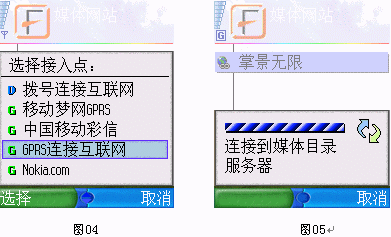 選擇" GPRS 連接互聯網"后,開始通過 GPRS 連接媒體目錄服務器,見下圖所示 :(圖04、05)