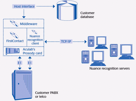 Prosody板卡位于系統(tǒng)的底層,已集成在VeCab系統(tǒng)中。FristContact 媒體服務(wù)器與Prosody硬件的通信是通過(guò)Aculab的統(tǒng)一API實(shí)現(xiàn)的。Prosody不僅用于TTS,而且也用于其它語(yǔ)音處理功能,例如放音、錄音、回音消除和DTMF檢測(cè)和生成。此外,VeCab 使用 Aculab的高密度數(shù)字網(wǎng)絡(luò)接口模塊來(lái)連接ACT的電話系統(tǒng)。