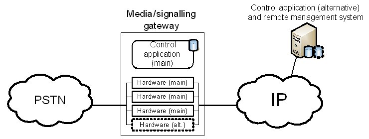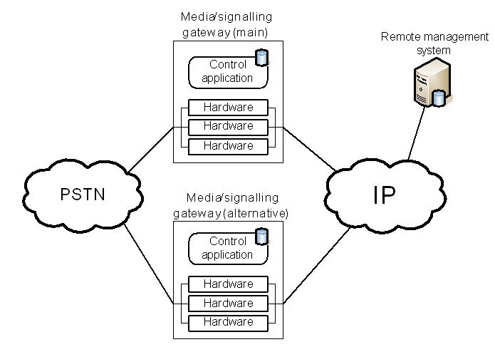 這兩種保護(hù)機(jī)制的區(qū)別可以從下面的例子進(jìn)一步闡述。該事例是一種企業(yè)IP-PSTN網(wǎng)關(guān)應(yīng)用。一般情況下,企業(yè)級的網(wǎng)關(guān)并不采用軟交換架構(gòu),所以媒體和信令網(wǎng)關(guān)功能在同一設(shè)備內(nèi)實現(xiàn)。這類網(wǎng)關(guān)是一個獨(dú)立的機(jī)架,內(nèi)裝能實現(xiàn)媒體和信令處理的硬件板卡和控制類應(yīng)用程序。此設(shè)備可以本地管理,也可以采用遠(yuǎn)程管理,如采用標(biāo)準(zhǔn)Web服務(wù)器。