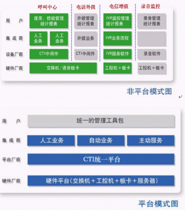 非平臺(tái)模式的系統(tǒng)建設(shè)需要采用多家設(shè)備,如不同廠家的交換機(jī)、語(yǔ)音板卡、CTI中間件、IVR服務(wù)軟件、錄音設(shè)備,以及相互獨(dú)立的、沒(méi)有統(tǒng)一設(shè)計(jì)的系統(tǒng)維護(hù)工具和業(yè)務(wù)界面。而平臺(tái)模式的系統(tǒng)建設(shè)只需要采用一家的設(shè)備,各業(yè)務(wù)模式在一個(gè)平臺(tái)上實(shí)現(xiàn),具備統(tǒng)一的管理工具。