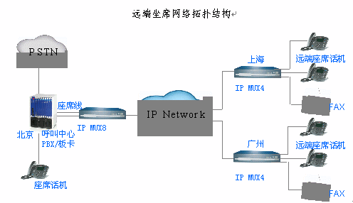 利用IP MUX系列網關可以把多個呼叫中心通過IP網絡匯接,中心的交換機負責所有呼叫的建立、釋放、應答和路由控制,并負責呼叫ID的產生和傳送。