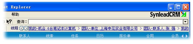 值得欣喜的是,部分CRM廠商意識(shí)到用戶迷路問題的嚴(yán)重性,并清楚IE瀏覽器具備的頁面歷史尋址(History Location)功能滿足不了頁面內(nèi)數(shù)據(jù)庫復(fù)雜、動(dòng)態(tài)歷史條件的記憶,必須另外打造屬于CRM應(yīng)用程序自身的歷史堆棧。少許CRM軟件開始提供歷史“后退”、“前進(jìn)”按鈕,SynleadCRM歷史精確度保持領(lǐng)先地位。