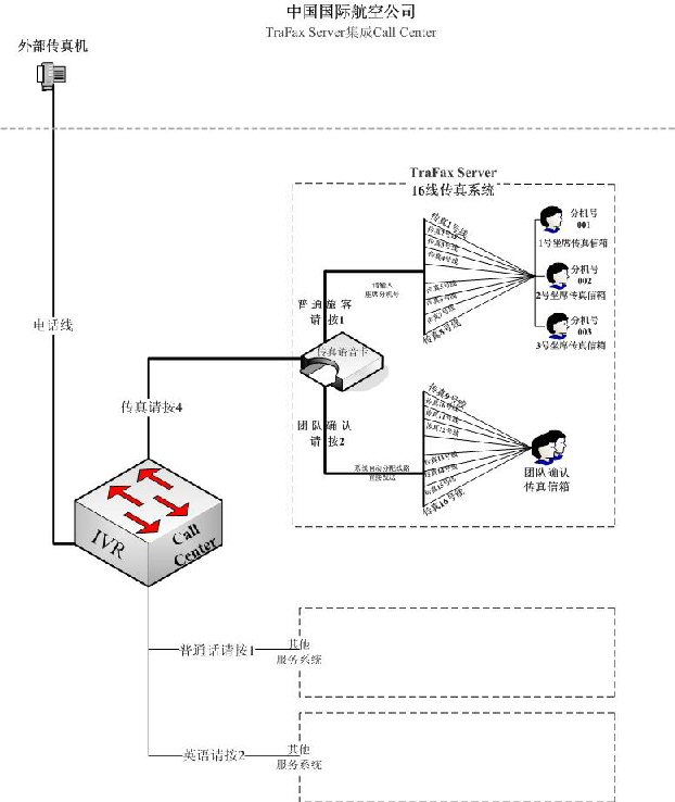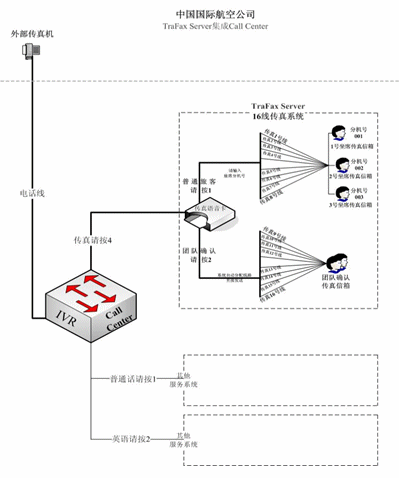 與國(guó)航Call Center集成后的TraFax Server系統(tǒng)共有16條傳真線路,其中一半專(zhuān)門(mén)用作接收普通旅客發(fā)來(lái)的傳真,另外8條線路則是為受理團(tuán)體客戶的傳真確認(rèn)而設(shè)。二者不同是,普通客戶在向國(guó)航發(fā)送傳真的過(guò)程中需要根據(jù)系統(tǒng)提示音在發(fā)送前的最后環(huán)節(jié)中輸入明確的坐席分機(jī)號(hào)碼,以使傳真文件發(fā)向分機(jī)號(hào)對(duì)用的坐席傳真信箱中,以此實(shí)現(xiàn)坐席人員對(duì)旅客的一對(duì)一式服務(wù),從而提高服務(wù)水平。而團(tuán)隊(duì)確認(rèn)的傳真無(wú)需輸入坐席分機(jī)號(hào),傳真將被空閑的線路直接發(fā)送到一個(gè)專(zhuān)門(mén)的團(tuán)隊(duì)確認(rèn)傳真信箱中,從而確保國(guó)航對(duì)該類(lèi)傳真的快速處理能力。目前,16線的TraFax