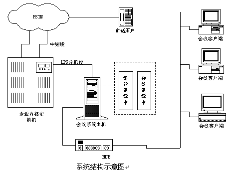 說明:如果沒有企業(yè)內(nèi)部程控交換機(jī)則可以將中繼線直接接在會議系統(tǒng)主機(jī)上,中繼線可以是普通模擬中繼,也可以是E1接口(如中國一號信令、30B+D等)。在與會議系統(tǒng)主機(jī)的同一網(wǎng)段上可以配置多個(gè)會議客戶端系統(tǒng),通過客戶端系統(tǒng)用戶可以隨時(shí)觀察和監(jiān)視會議系統(tǒng)的使用情況,并且可以建立常用用戶的用戶資料,也可以對常用用戶進(jìn)行分組,這樣要呼叫某些用戶開會時(shí)只需呼叫組用戶即可;