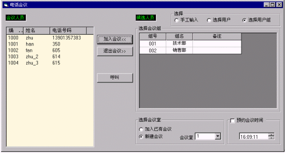 會議組織方通過客戶端查找到要參加會議的各方資料,建立會議,系統(tǒng)將自動(dòng)呼叫這些電話,呼通后自動(dòng)加入會議;