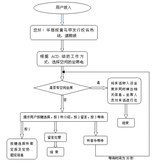 當坐席全忙時,IVR流程會引導用戶按鍵選擇聽取介紹、留言及聽音樂等待,用戶可按鍵選擇聽取介紹(包括定報及定奶的信息),聽完介紹用戶可按鍵選擇繼續(xù)聽介紹或轉人工服務;用戶選擇留言時,IVR流程會提示用戶留下電話及投訴內(nèi)容,有指定的坐席人員每天聽取留言并進行處理,從而減少了由于話務量集中而坐席人員無法及時處理的投訴電話。用戶選擇等待時會聽到一段優(yōu)美的音樂,當坐席有空閑時電話會被及時的轉入坐席由坐席人員進行處理。