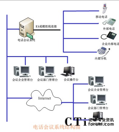 TalenTel CNF電話(huà)會(huì)議系統(tǒng)可以與程控交換機(jī)配合使用,也可以直接與局方的系統(tǒng)進(jìn)行連接,系統(tǒng)的構(gòu)成含如下幾部分:TalenTel CNF電話(huà)會(huì)議系統(tǒng)服務(wù)器(ctsIVR)、會(huì)議企業(yè)管理員模塊、會(huì)議部門(mén)管理員模塊、會(huì)議操作員管理模塊、數(shù)據(jù)庫(kù)等組成。