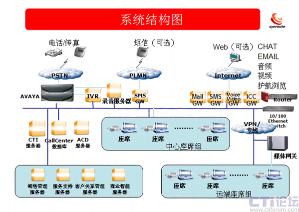 基于AVAYA S8720 交換機(jī),部署PBX、CTI服務(wù)器、Hi-Link核心控制框架、CTI Server、IVR交互式語音應(yīng)答、TTS、智能傳真系統(tǒng)、座席錄音管理、報(bào)表統(tǒng)計(jì)分析、呼叫中心監(jiān)控管理、系統(tǒng)配置管理、業(yè)務(wù)軟件等。