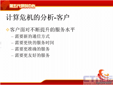 我把第五代呼叫中心的概念詳細地論述一下。主要是分成五個部分,第一個是第五代呼叫中心的定義;第二個計算危機的現(xiàn)狀;第三是計算危機的分析;第四第五代呼叫中心;第五是結(jié)論——迎接第五代呼叫中心的挑戰(zhàn)。