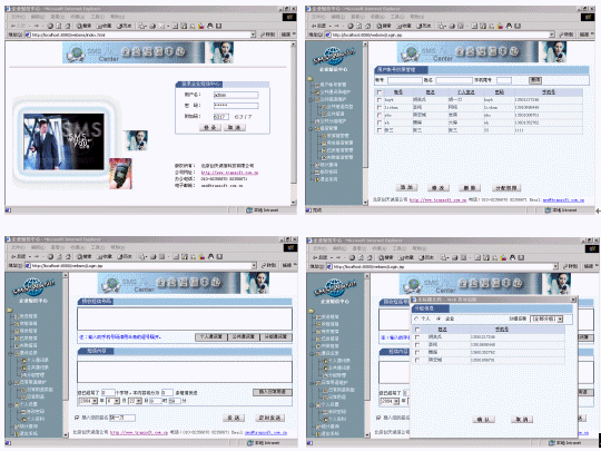 企業(yè)里的每個用戶要實現(xiàn)短信發(fā)送,僅需一臺電腦,然后利用瀏覽器就可以實現(xiàn)分組發(fā)送(如:會議通知、緊急通知)、定時群發(fā)(如:提醒短信、恭賀短信、祝福短信)、以及接收工作情況匯報短信等,系統(tǒng)提供通訊薄管理,可編輯常用短語。服務(wù)器端支持多個GSM設(shè)備群發(fā),滿足不同發(fā)送短信量的需要?煨┫螺d系統(tǒng)的動畫演示,新增功能多多。。