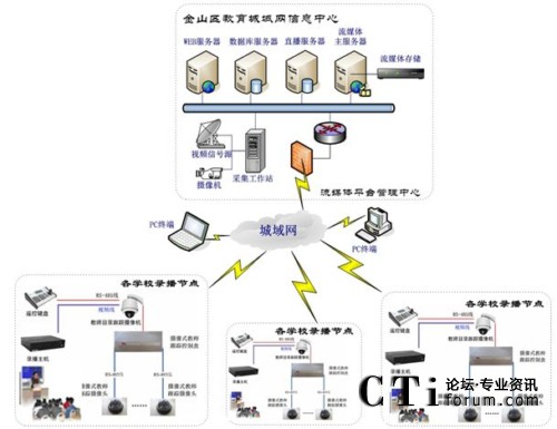 流媒體平臺采用分布式架構(gòu)部署,分為web服務(wù)器,數(shù)據(jù)庫服務(wù)器、直播服務(wù)器和流服務(wù)器,如有必要可在信息中心架設(shè)采集工作站搭建網(wǎng)絡(luò)電視或?qū)崨r直播應(yīng)用,在各個學(xué)校已經(jīng)部署錄播系統(tǒng)或直播系統(tǒng)的教室配置流媒體功能組件,這樣錄播實(shí)況可以實(shí)時傳送到流媒體平臺管理中心的全局直播服務(wù)器上,同時錄播的學(xué)校本色課件也可以上傳存儲到金山區(qū)教育局信息中心的流存儲服務(wù)器上,方便今后的檢索、點(diǎn)播、評估等各種應(yīng)用。