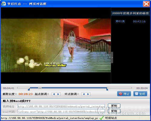 拖動(dòng)進(jìn)度條左右的打點(diǎn)按鈕可以設(shè)定片段的開始和結(jié)束時(shí)間點(diǎn),還可以點(diǎn)擊起點(diǎn)微調(diào)和重點(diǎn)微調(diào)的左右箭頭對(duì)截取的視頻進(jìn)行微調(diào),然后點(diǎn)擊“生成”,再點(diǎn)擊“復(fù)制”可以將截取的節(jié)目URL粘貼到WORD、PPT、BBS或BLOG等頁面中。