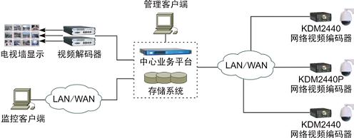 KDM2440/2440P可作為網(wǎng)絡(luò)視頻監(jiān)控系統(tǒng)的智能化前端接入單元,與攝像機(jī)一起實(shí)現(xiàn)監(jiān)控點(diǎn)的集成化部署,攝像機(jī)采集的模擬視頻信號(hào)經(jīng)編碼處理后以IP碼流形式上傳至中心業(yè)務(wù)平臺(tái),在監(jiān)控客戶端的管理和控制下,中心業(yè)務(wù)平臺(tái)將上傳的碼流按需轉(zhuǎn)發(fā)到監(jiān)控客戶端、視頻解碼器以及網(wǎng)絡(luò)錄像單元,分別實(shí)現(xiàn)PC瀏覽、電視墻顯示以及錄像存儲(chǔ)。