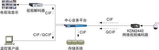 KDM2440/2440P集成了雙碼流功能,可對(duì)單路模擬視頻進(jìn)行CIF和QCIF兩種格式的同時(shí)編碼上傳,并由中心業(yè)務(wù)平臺(tái)進(jìn)行差異化轉(zhuǎn)發(fā)。比如,視頻解碼器和錄像存儲(chǔ)單元接收CIF視頻,可實(shí)現(xiàn)較高清晰度的圖像顯示和存儲(chǔ),而客戶端接收QCIF視頻,可有效降低PC資源的消耗,從而保證客戶端在進(jìn)行多畫面視頻實(shí)時(shí)瀏覽時(shí)的應(yīng)用效果。