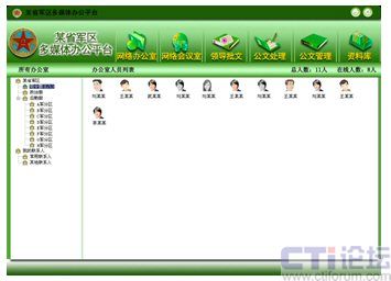如圖所示的畫(huà)面即為網(wǎng)動(dòng)協(xié)同辦公系統(tǒng)的基礎(chǔ)工具——協(xié)同通訊系統(tǒng),該系統(tǒng)可將部隊(duì)機(jī)構(gòu)內(nèi)的所有部門(mén)、人員按照實(shí)際的組織結(jié)構(gòu)列出,應(yīng)用該系統(tǒng)的人員通過(guò)點(diǎn)擊其他在線(xiàn)人員,從而有選擇性的與對(duì)方進(jìn)行語(yǔ)音、視頻、數(shù)據(jù)共享、點(diǎn)對(duì)點(diǎn)會(huì)議等各種操作,將以往“看不見(jiàn)”的對(duì)話(huà)變?yōu)椤懊鎸?duì)面”的交流。相比于傳統(tǒng)的電話(huà)溝通而言,它不僅更暢通快捷,更可以最大化的降低溝通成本。另外,數(shù)據(jù)共享功能還可以將軍隊(duì)里需共同探討的話(huà)題,如作戰(zhàn)地圖動(dòng)態(tài)研究、工作報(bào)告資料等實(shí)時(shí)顯示在數(shù)據(jù)區(qū)中,雙方通過(guò)電腦即可進(jìn)行遠(yuǎn)程的話(huà)題討論、圈點(diǎn)批注。