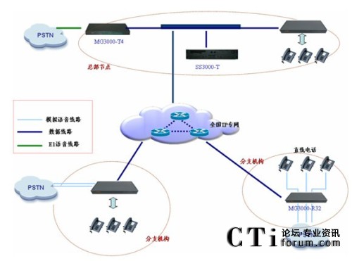 對(duì)一些大的機(jī)構(gòu),如北京總部等,規(guī)模大,有數(shù)字中繼接入資源,對(duì)于這些結(jié)構(gòu)可利用數(shù)字中繼網(wǎng)關(guān)連接內(nèi)部電話網(wǎng)和PSTN網(wǎng)。