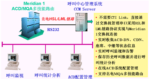 華呼CCM系統(tǒng)不需要Meridian Link,直接通過交換機(jī)管理串口采用HSL(High-Speed Link)和LML(Load Management Link)鏈路協(xié)議實現(xiàn)與Meridian 1交換機(jī)連接;實時收集ACD座席、隊列、中繼等狀態(tài)信息,提供實時監(jiān)控和告警;保存各類歷史呼叫數(shù)據(jù),提供多種統(tǒng)計分析手段;提供ACD有關(guān)參數(shù)的實時和預(yù)定配置管理功能;支持北電MQA(Multiple Queue Assignment)技能路由功能,使座席可同時登錄到5個ACD隊列,在交換機(jī)內(nèi)部實現(xiàn)技能路由;對各類數(shù)據(jù)分析以表格、直方圖、餅圖等方式進(jìn)行直觀顯示并可進(jìn)行打印,以及提供多樣的告警提示。
