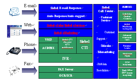 Siebel eService 、Siebel eMail Response能夠使企業(yè)通過Web和Email管理與實現(xiàn)其服務處理流程,為客戶提供了自助服務和有助服務的選擇。該應用系統(tǒng)可以很方便地為客戶創(chuàng)建新的服務請求,輸入服務細節(jié),跟蹤服務的執(zhí)行情況和過程,并可以實時監(jiān)控服務的執(zhí)行結(jié)果。Siebel eService提供了人性化的個人主頁,對呼叫中心進行Web協(xié)同的支持,"call me now"的支持,以及支持全文本檢索系統(tǒng)等功能,如圖五所示。 通過在線訪問Siebel歷史數(shù)據(jù)庫,客戶可以自助地獲取問題的解決方案或通過網(wǎng)絡互動技術,與在線代理員進行網(wǎng)絡協(xié)同、文本聊天、共享畫板,進一步得到更加個性化的服務。通過使用Siebel eSmartScript超強的客戶檔案信息分析管理應用,可以為客戶提供附加powerpoint方案,word文檔的自動生成管理能力。 Siebel eService集成了客戶滿意度調(diào)查模塊,可以實現(xiàn)在線的客戶滿意度調(diào)查,通過其企業(yè)可以了解客戶的滿意程度,以及當前客戶所關心的問題或所感興趣的產(chǎn)品。Siebel eMail Response提供了增強的Email相應標準模板,可以使客服中心更加有效地通過Email與客戶進行交流。