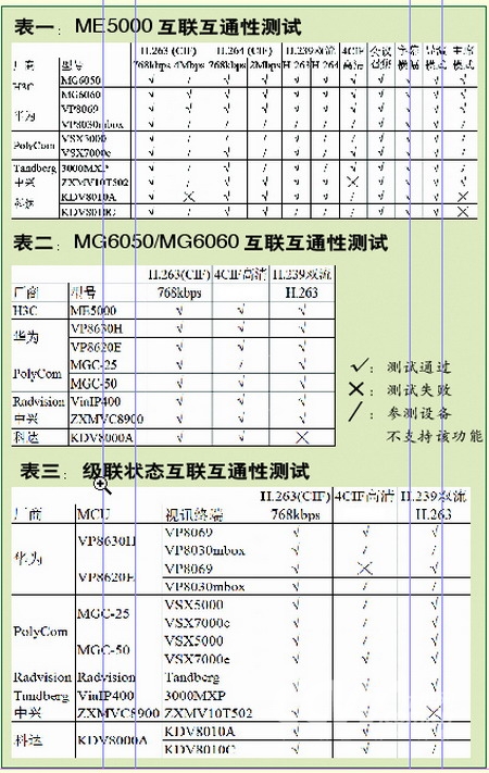 眼見(jiàn)為實(shí),為了驗(yàn)證H3C視訊產(chǎn)品的互聯(lián)互通性,我們對(duì)其進(jìn)行了實(shí)際測(cè)試;ヂ(lián)互通性屬應(yīng)用級(jí)特性,測(cè)試起來(lái)并不困難,但有些煩瑣。由于視訊系統(tǒng)核心組件通常包括MCU和視訊終端兩類設(shè)備,兼容性互有交叉,因此我們將測(cè)試分成3組進(jìn)行。參與測(cè)試的設(shè)備除H3C的MCU(多點(diǎn)控制單元)ME5000和視訊終端MG6050/MG6060外,還包括其它5個(gè)廠商的7款MCU和8款視訊終端。