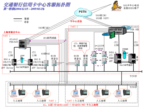 2005年1月底,由恒融數(shù)碼簽定的交通銀行太平洋信用卡中心客戶服務(wù)系統(tǒng)項(xiàng)目順利上線,該系統(tǒng)采用阿爾卡特的AcatelOmniPCX4400程控交換機(jī)系統(tǒng)、Genesys的 CTI架構(gòu)、EDIFY的IVR。一期擬提供CO端的接入線路為540線;外撥線路為 60線的外撥,480路的IVR服務(wù)、60路傳著服務(wù)、120個(gè)座席服務(wù)、20個(gè)專業(yè)外撥服務(wù)。