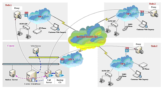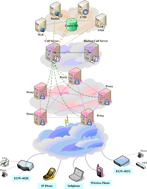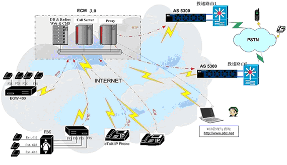 無(wú)論大型企業(yè)用戶(通過PBX接入網(wǎng)關(guān)設(shè)備)、小型企業(yè)用戶(使用網(wǎng)關(guān)設(shè)備)還是其它使用單口網(wǎng)關(guān)或IP Phone的用戶,都可以通過各種接入方式接入到ECM3.0網(wǎng)絡(luò)中,并通過PROXY及MEDIA