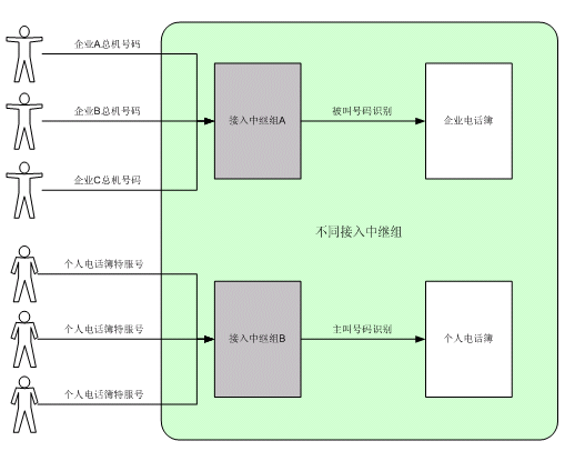 企業(yè)電話簿呼叫中,系統(tǒng)將根據(jù)被叫號(hào)碼判別進(jìn)入相應(yīng)的企業(yè)電話簿,提供相應(yīng)的集團(tuán)總機(jī)服務(wù)。如需在同一組接入中繼中同時(shí)提供企業(yè)電話簿業(yè)務(wù)和個(gè)人電話簿業(yè)務(wù),則系統(tǒng)將首先進(jìn)行被叫號(hào)碼鑒別。若存在與被叫號(hào)碼相對(duì)應(yīng)的企業(yè)電話簿,則提供企業(yè)電話簿服務(wù);否則,進(jìn)行主叫號(hào)碼鑒別,判斷是否提供個(gè)人電話簿服務(wù)。